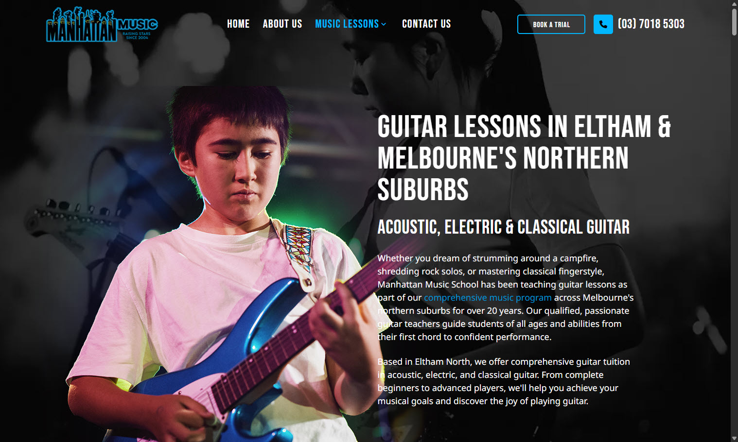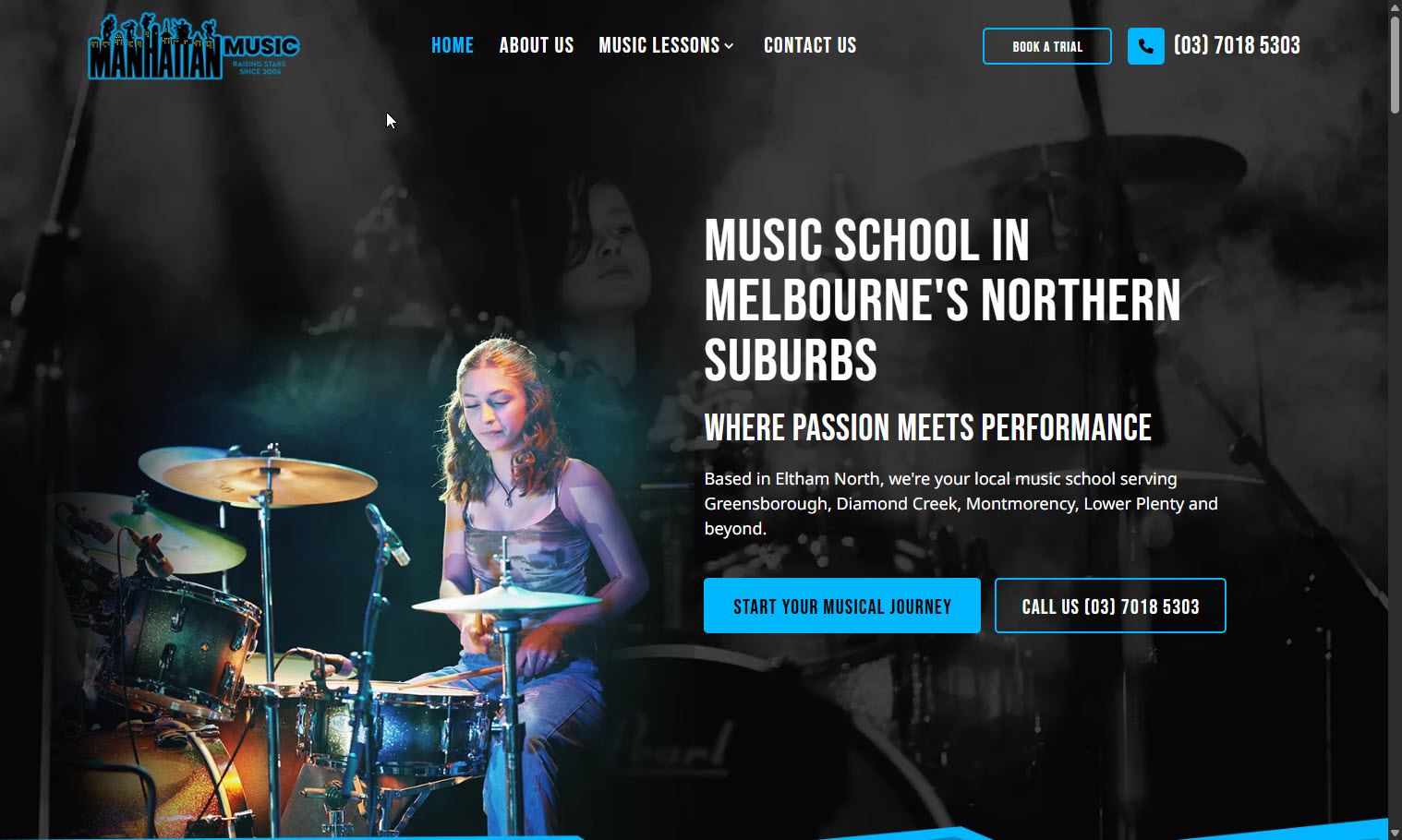 Manhattan Music is a well-established music school based in Eltham North, Melbourne's Northern Suburbs, with over 20 years of experience teaching students of all ages. They approached WebSolved needing a fresh, modern website that reflected the energy and professionalism of their school, one that could attract new students across Melbourne's Northern Suburbs and clearly communicate everything they offer.